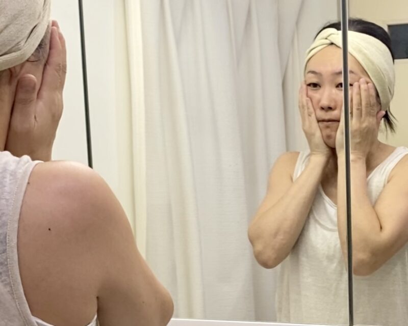 夜はお風呂上がりに2回を分けてつけています。1回目は手のひらの中で温めて顔を包むように付け、2回目は頬のラインから持ち上げるようにマッサージも兼ねて優しく付けています。