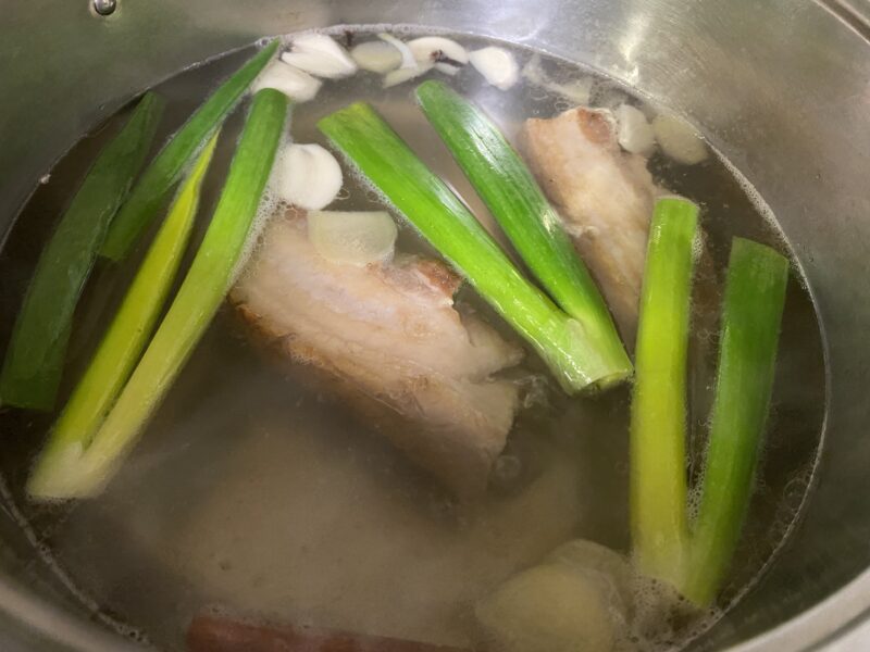 [A] 長ねぎの青い部分(2本分)、しょうが(一欠片スライスする)、ニンニク(3欠片皮を剥いて半分に