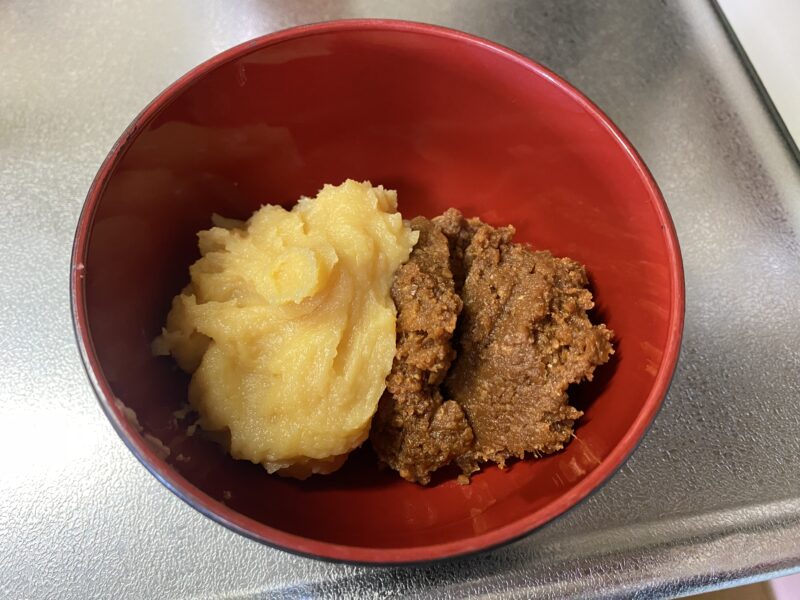 「やさかみそ」の代わりにスーパーで売っている赤味噌と白みそにしました