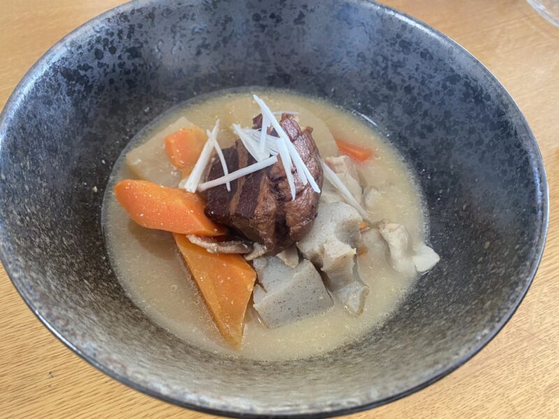 先ず、具材の大きさに驚き、豚汁のトッピングに角煮!?と驚きの連続の豚汁でした。
