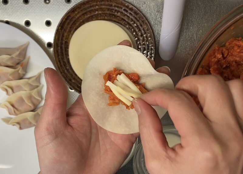 ②餃子の皮に包む時にチーズも一緒に包みます