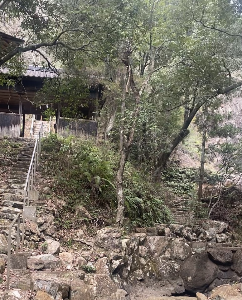 ぐんぐん進んでいくと右手に深谷の滝、左手に神社が見えてきました。
