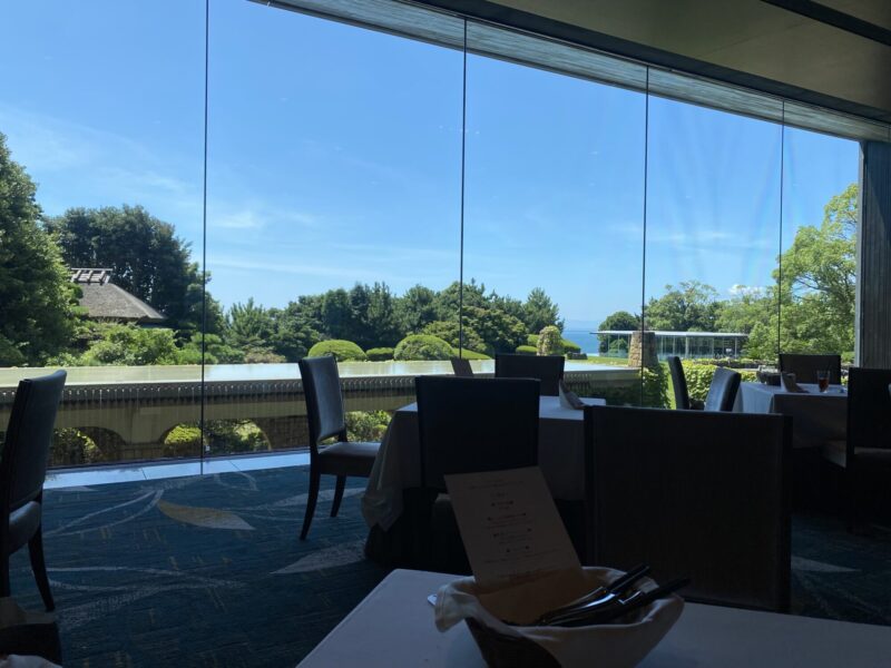 レストランの一面の窓から素敵なお庭とその向こうに広がる海を眺めることができ、贅沢な時間を過ごせます♬