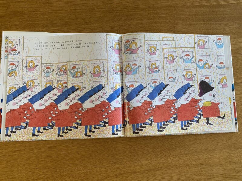 しかし、最後に残った小さな国。そこには、兵隊も武器もありませんでした。その国の人々は、自分たちで歌い、踊り、助け合い、とても幸せそうでした。