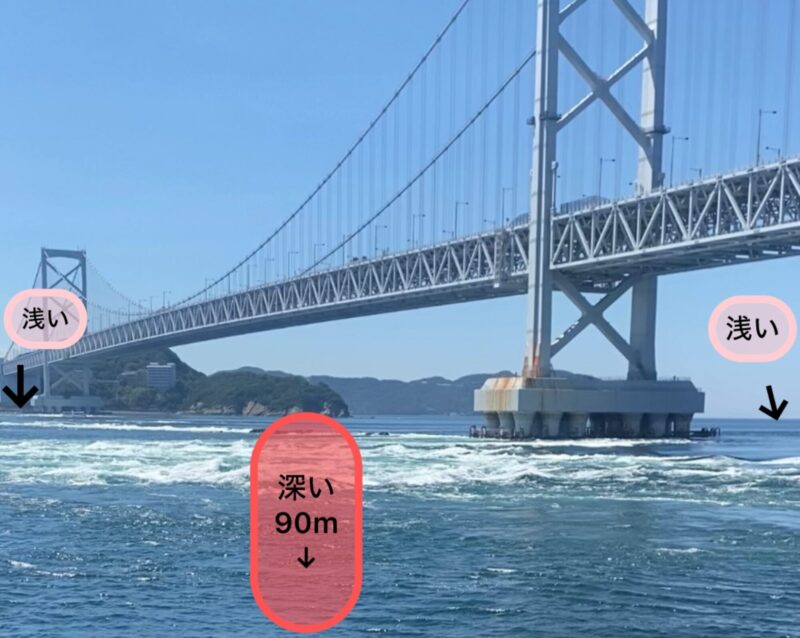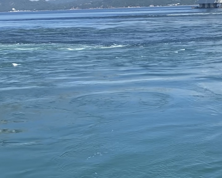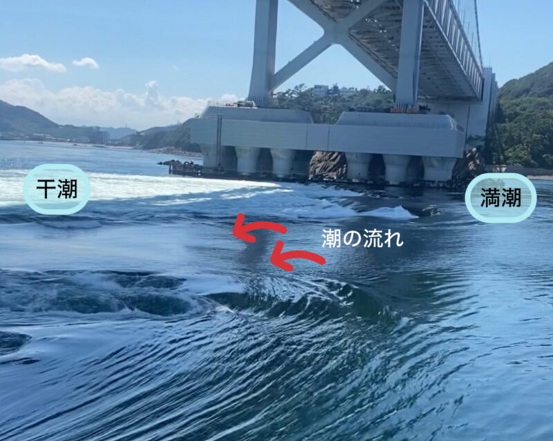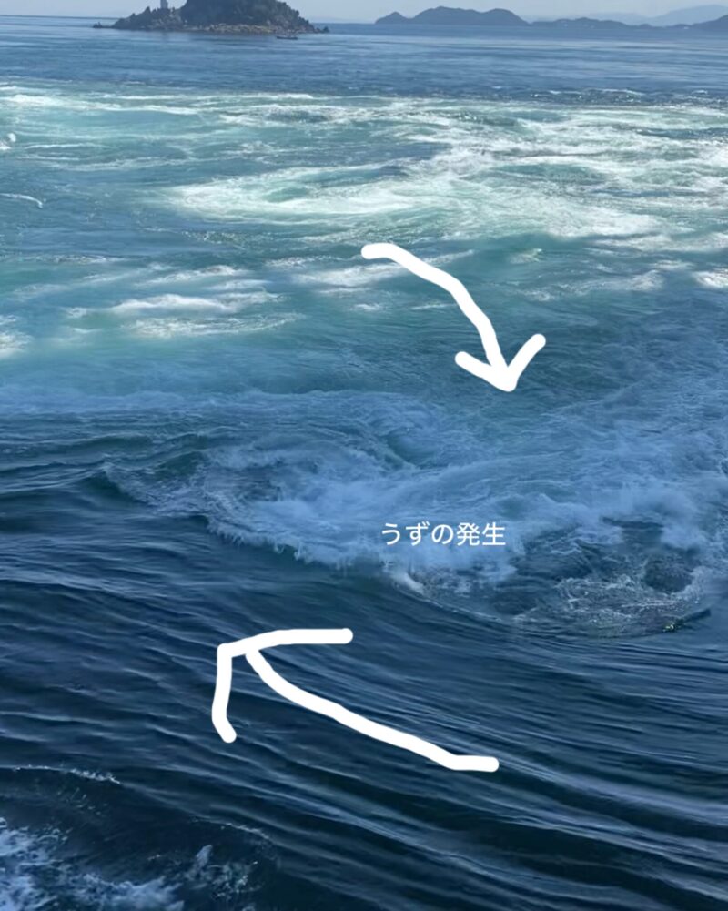 瀬戸内海が満潮の時は紀伊水道へ、紀伊水道が満潮の時は瀬戸内海へと潮が流れるため、6時間ごとに海峡の両側で交互に渦が発生します。