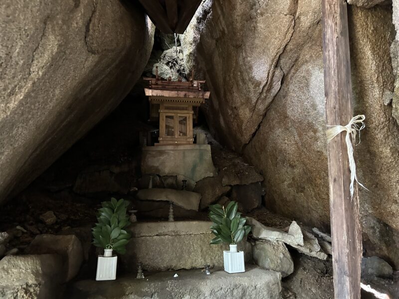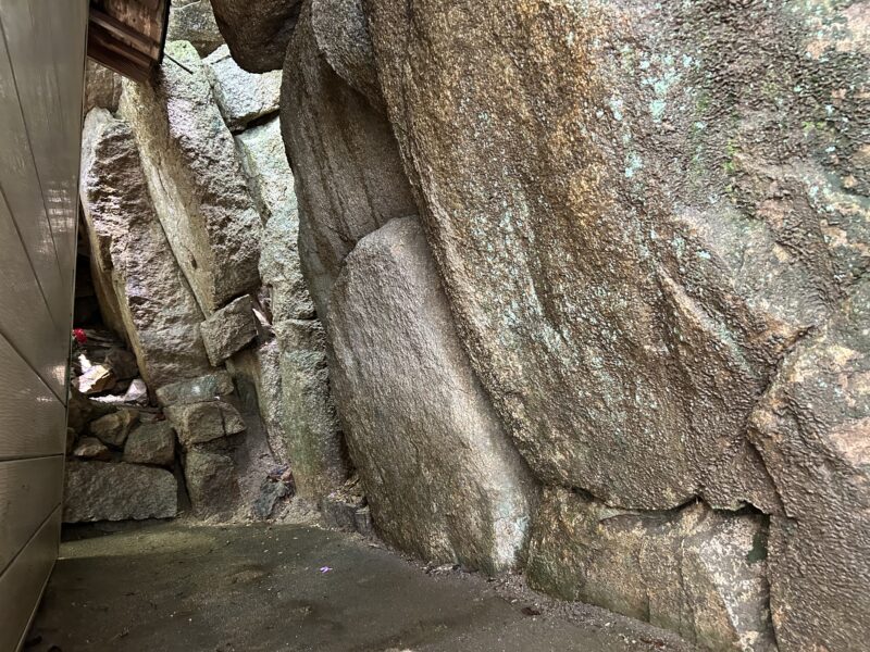 一般的な神社とは違い、社殿の奥にある巨大な磐座(いわくら)を御神体としています。