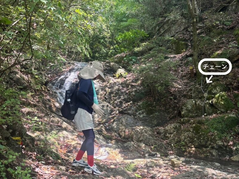 滝を渡って更に上に登って行くのですが、チェーンを伝って登ります。