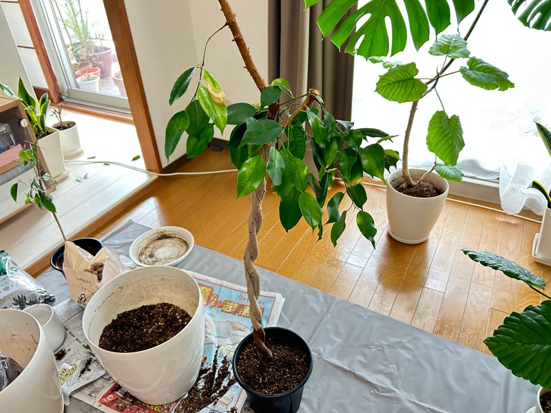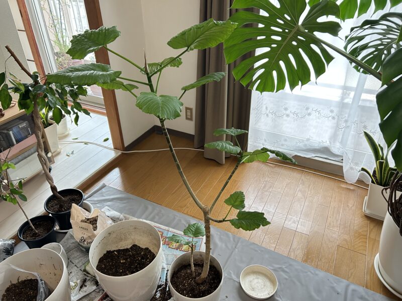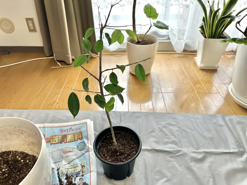 水捌けを良くするために、鉢底の石も多めに入れて、粒の粗い観葉植物の土を底に入れて今まで使っていた土と混ぜ合わせて被せた