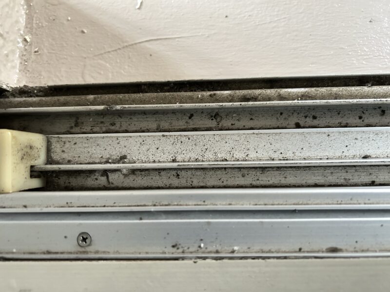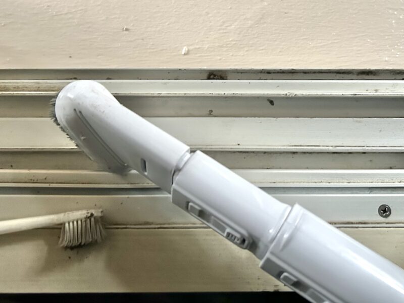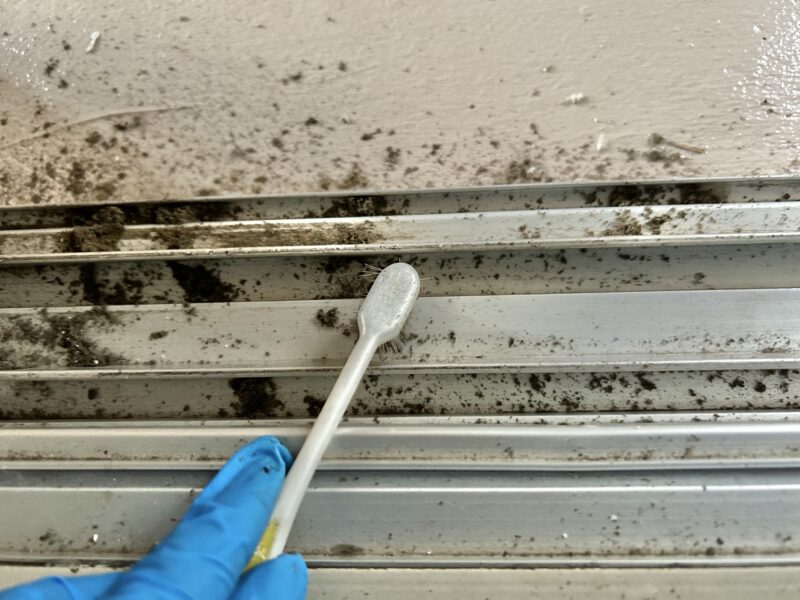 無闇に水をかけると後が大変とわかったので、こっちの窓は歯ブラシを使って汚れをかき出し、掃除機で吸い取ることにした