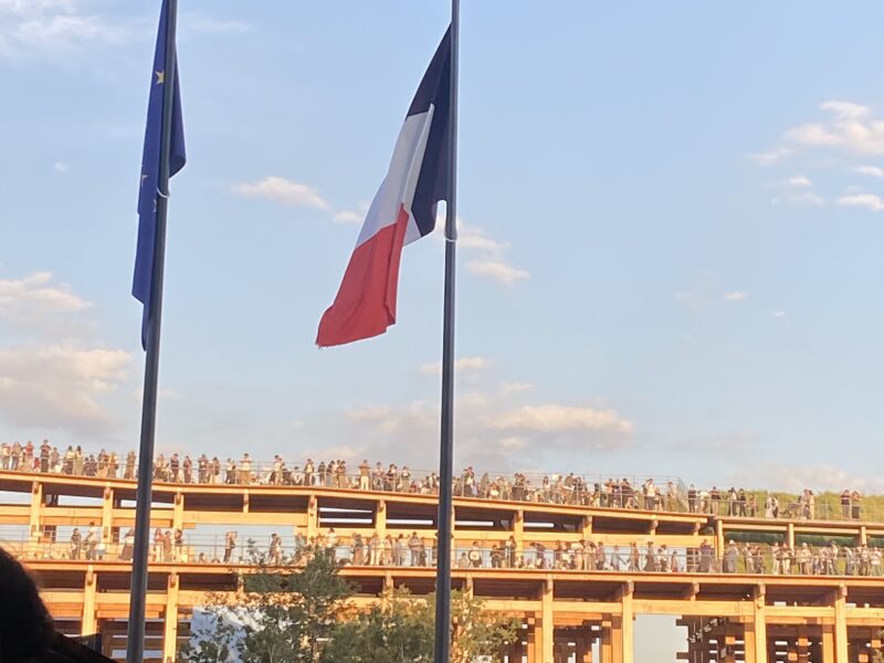 18:20〜の予約なのでそれまで、フランスパビリオンの前広場のベンチに座って食事休憩〜!