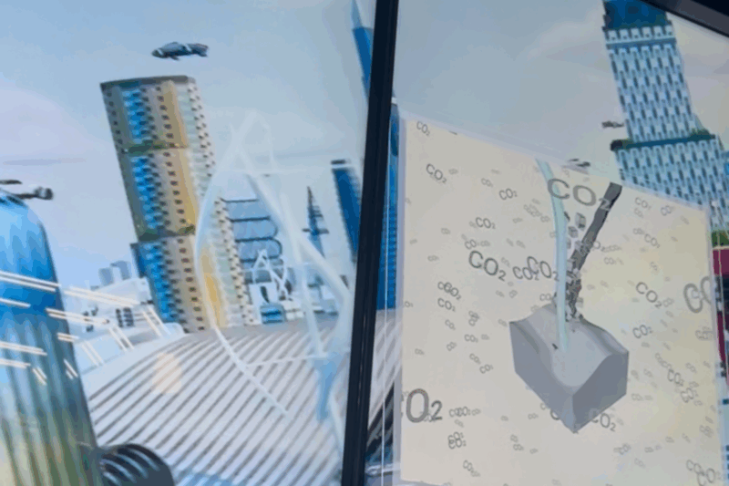 ここには未来の乗り物やCO2を吸収するコンクリートでできたビル群など25年ごの未来の世界が広がっていました