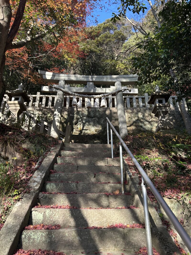 橋を渡った先には石の階段が続いていて、その上に鳥居がある