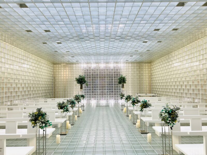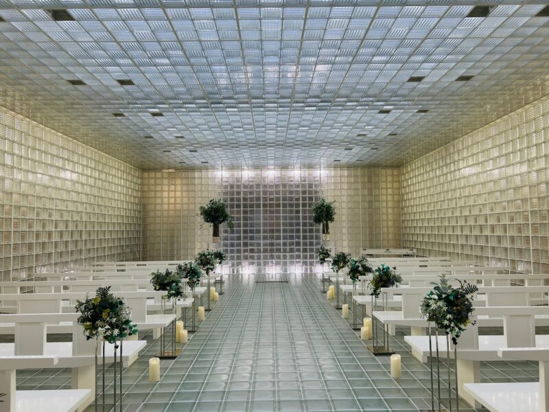 ガラスに覆われた他に例のないチャペルは、天候によって内部に降り注ぐ光の加減で雰囲気が変わるの!