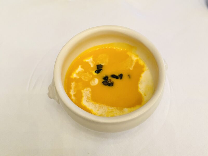 ・えびす南瓜のポタージュ 黒豆のエクラゼ